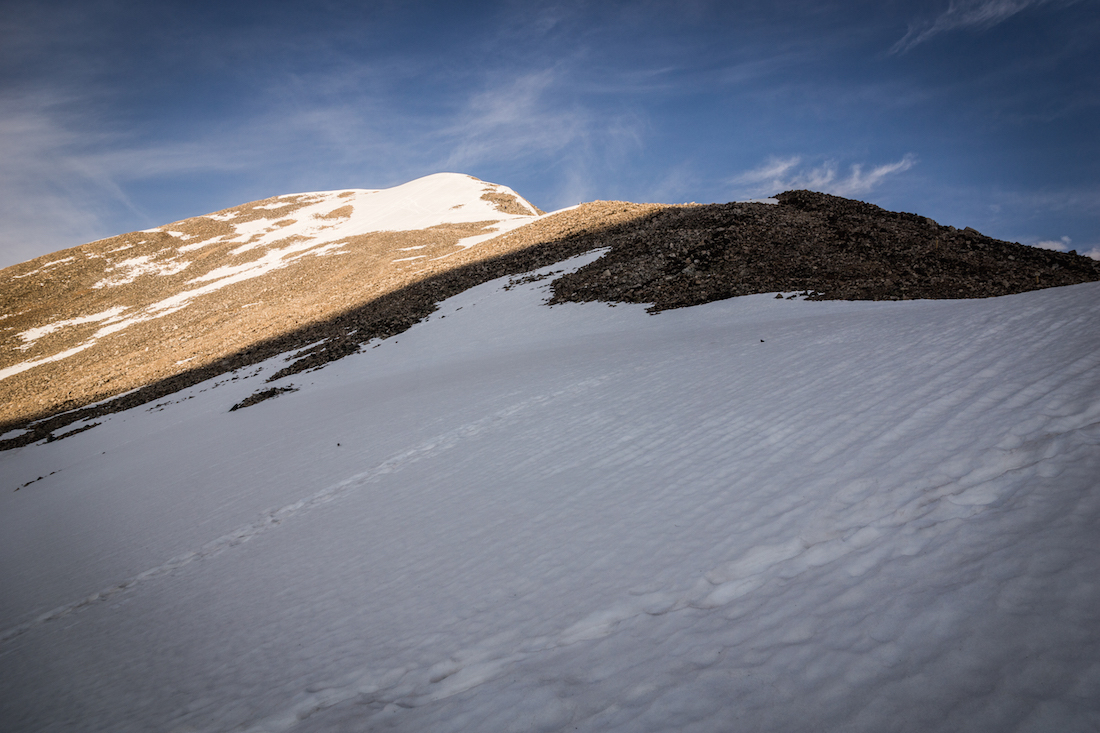 I drove up the almost completely dry road to Kite Lake, the start-point of the adventure. A few cars were parked at the trailhead, and I could see people bustling around tents, preparing for a day of climbing. Already packed and good to go, I grabbed my stuff and headed down the trail towards the first peak, Mt. Democrat, promptly at 5:40 AM. On the drive over I could tell there was going to be more snow on the mountains than I was accustomed to (I typically shoot for 14er climbs in July and August), but I had prepared by bringing my microspikes. I only used them a handful of times, and they probably were not crucial, but they were definitely nice to have on spots that were a bit steeper and covered in slush and ice.