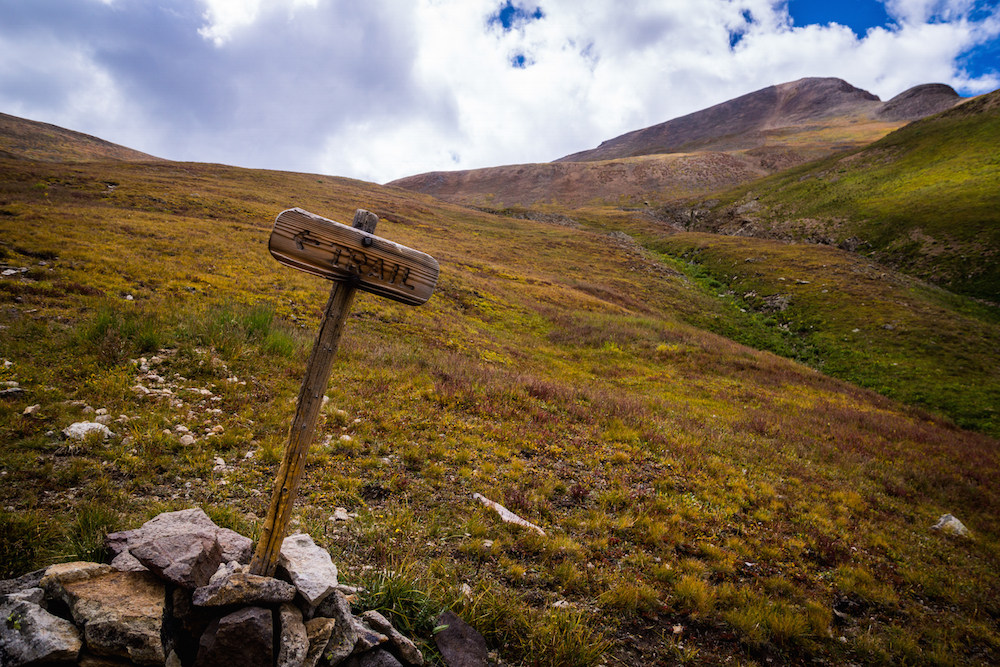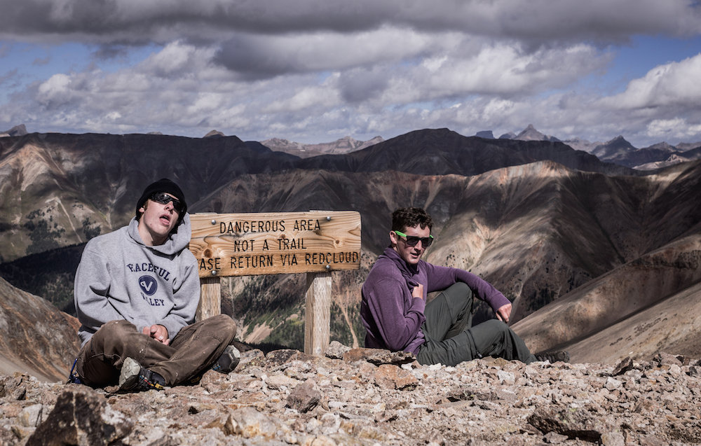After an eternity of slow progress, I climbed atop a rock outcropping that gave me a decent view of Sunshine. Skyler was standing some ways off in the distance. My hands had absolutely no feeling left in them, but I nevertheless made a halfhearted attempt to wave to him and indicate that I was alive. We exchanged pleasantries, and I breathed a sigh of relief at having made it past the worst part of my climb. I crawled the rest of the ways to the saddle, a sad sight indeed by the time I rejoined Skyler. A sign on the saddle highlighted the error of our ways.