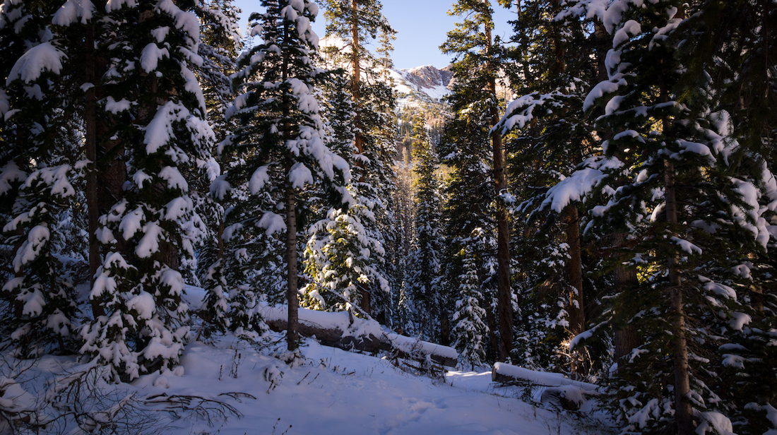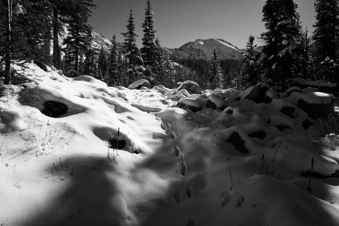 The trail started out dry and clear, but it wasn’t long before we were among the recent snowfall. No human footprints marred the white landscape, a good sign that we wouldn’t encounter any of the Gunnison area’s many hunters.