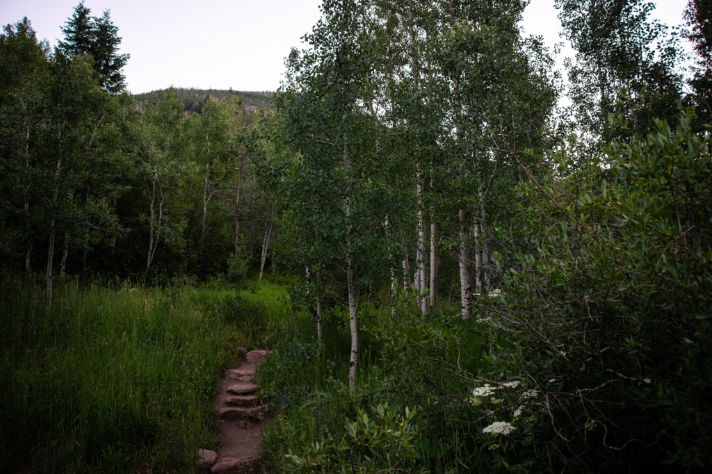 Two rules of thumb when going on day hikes in Colorado: always try to leave before sunrise, and never take east-bound I-70 on a Sunday afternoon. We managed one of these on a recent Sunday when we left for the Vail area to make the hike up to Deluge Lake. The sun hadn’t yet crested the mountains as we started an immediate uphill through an aspen grove.