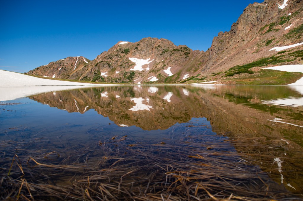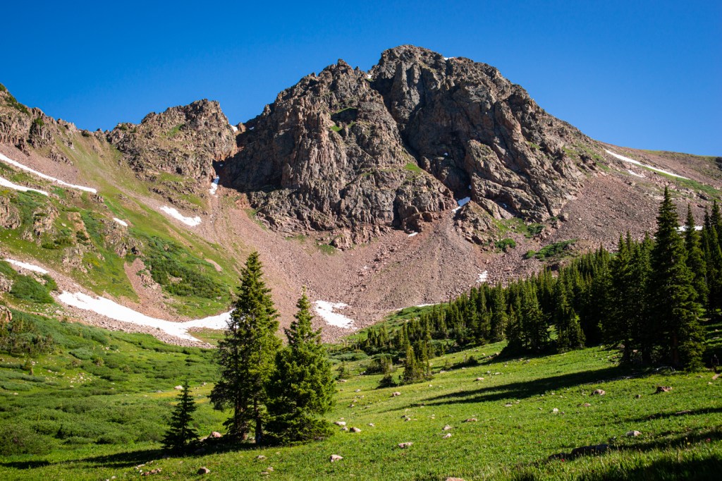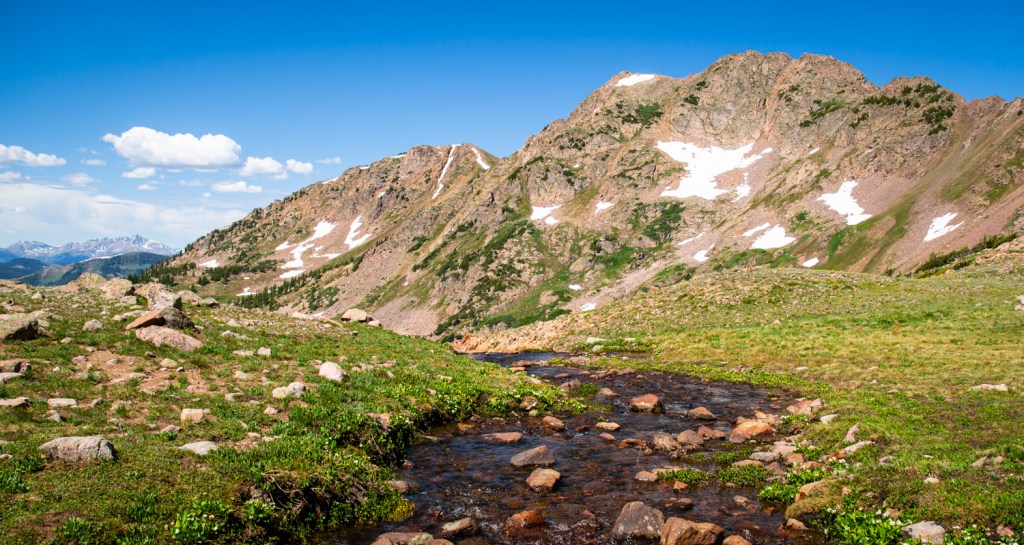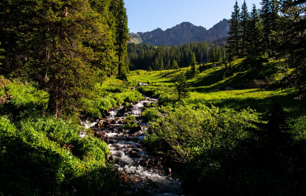 Despite conditions concurrent and impending, we made it to a flatter section of trail after mile three. Fording a stretch of creek into an open meadow, we got our first glimpses of an iconic Gore Range ridge ahead.