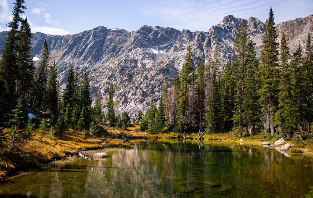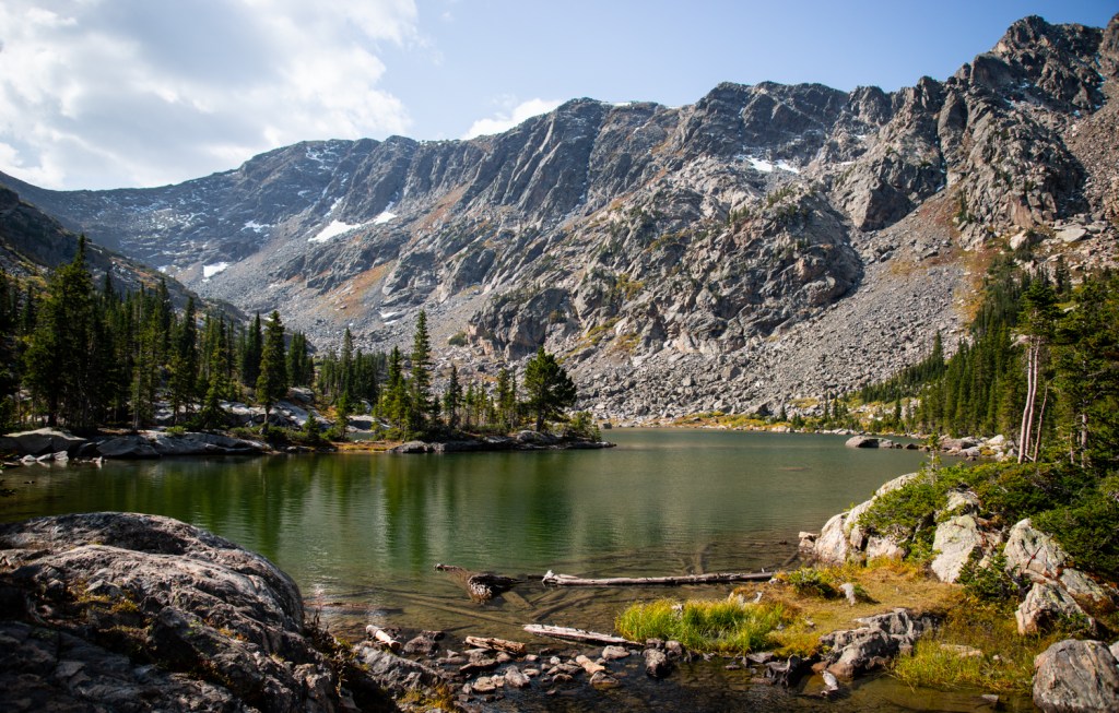 The route became more steep after taking a left at what our best guess was the official fork in the trail. It wasn’t long before granite peaks poked out above the trees. We were stunned to find the view open up after a particular bend in the trail at the pond just before Brady Lake. There, like a slap in the face, was the Continental Divide standing over us.