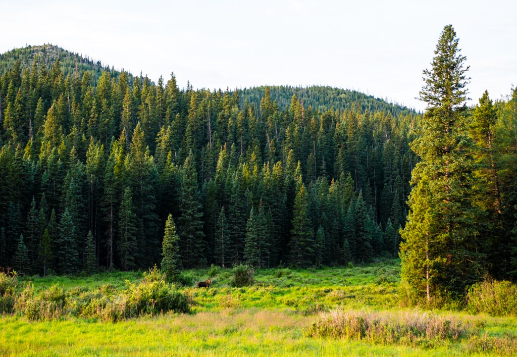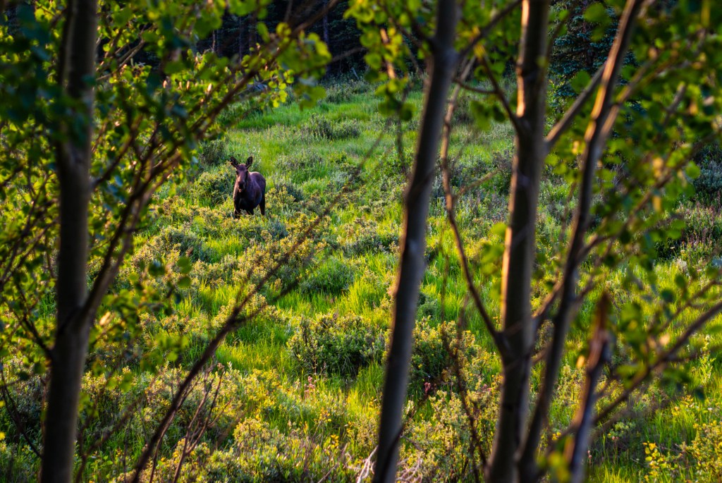 Suddenly, movement caught my eye in the distance. I stopped in my tracks and was immediately disappointed with my decision not to lug a telephoto lens along for this adventure: a moose had appeared from behind some large bushes across the meadow. I could tell the moose had noticed me—even from a distance—and I grew concerned when I realized the way forward would bring me uncomfortably close to him.