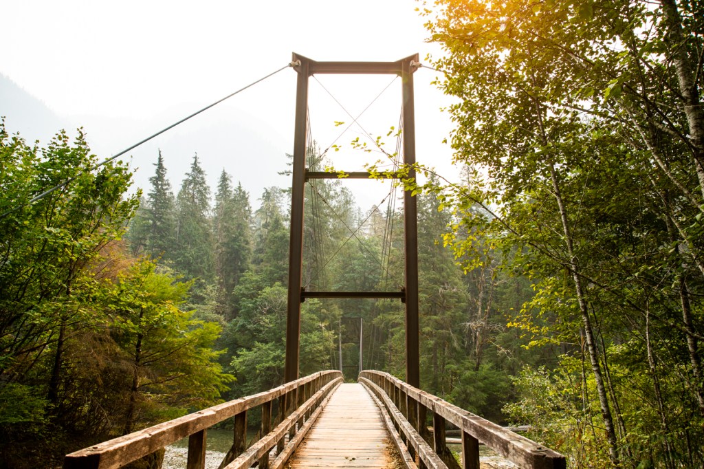 Baker Lake, a sizable reservoir built in 1959 by expanding a pre-existing natural lake of the same name, lies between Mount Baker and a series of smaller peaks to the east. As we drove alongside the water, neither Baker Peak nor any of the smaller peaks were visible. Smoke blanketed the area. It was a scene that, being from Colorado, we were sadly familiar with. Still, the haze was likely the reason behind the near empty parking area that we found at the Baker River trailhead.