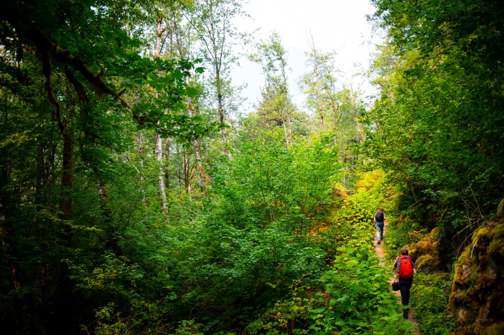After crossing the bridge, we were no longer following along the river. Instead, the trail veered into the wild green yonder of the surrounding rainforest. This was maybe the most exciting part of the hike. The next several miles of trail toured along ridges and ravines that were dense with (plant) life. Fauna made no appearance, save for a few squirrels and slugs, in this stretch. The smoke clouded the treetops.