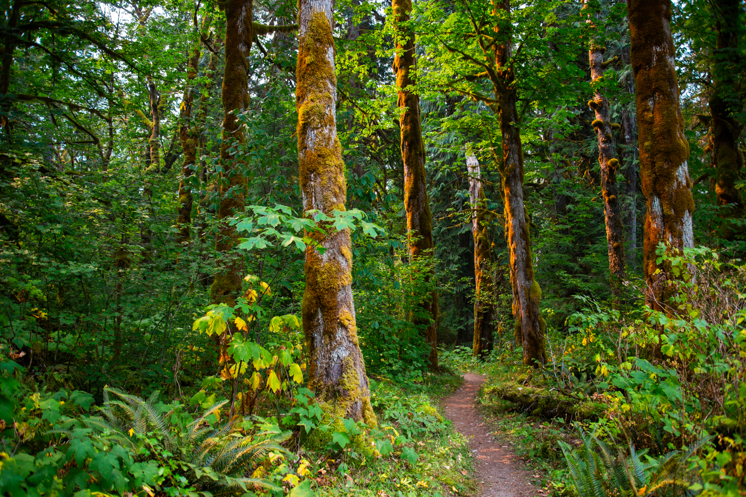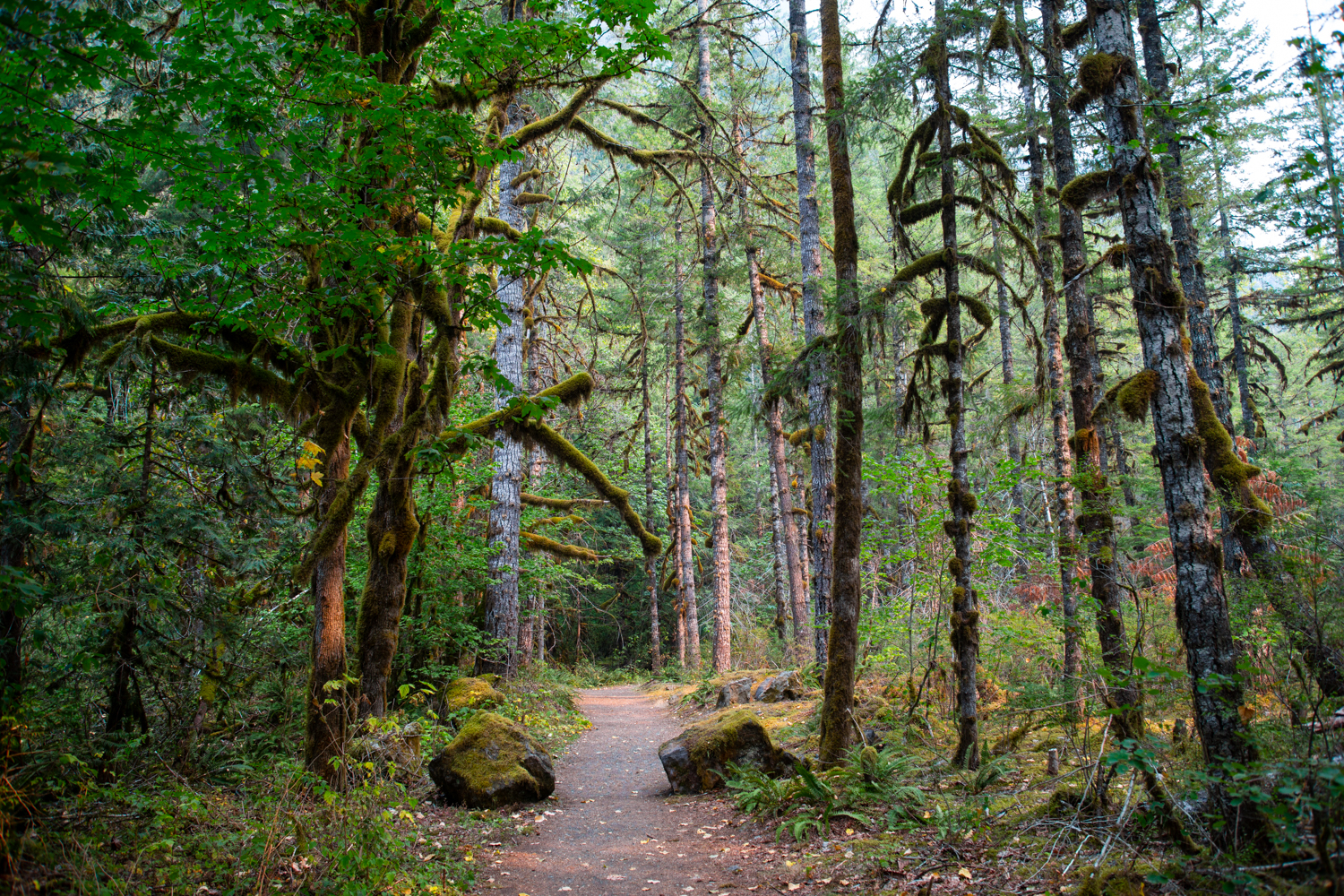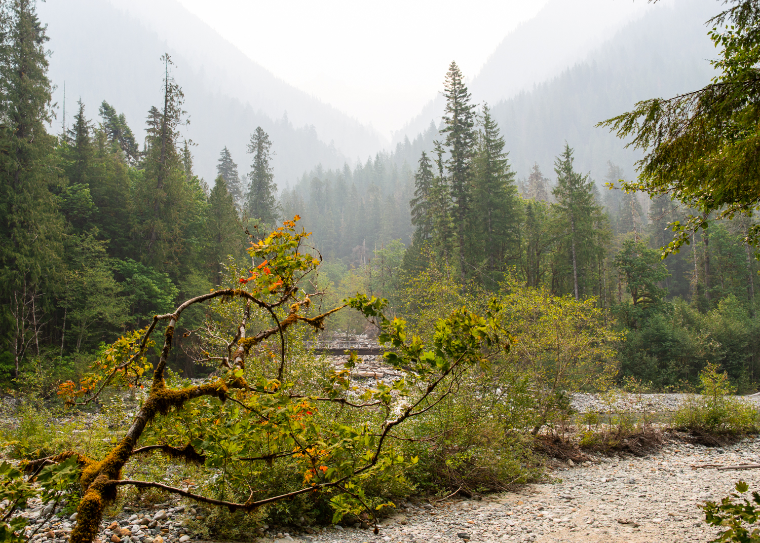 Baker Lake, a sizable reservoir built in 1959 by expanding a pre-existing natural lake of the same name, lies between Mount Baker and a series of smaller peaks to the east. As we drove alongside the water, neither Baker Peak nor any of the smaller peaks were visible. Smoke blanketed the area. It was a scene that, being from Colorado, we were sadly familiar with. Still, the haze was likely the reason behind the near empty parking area that we found at the Baker River trailhead.