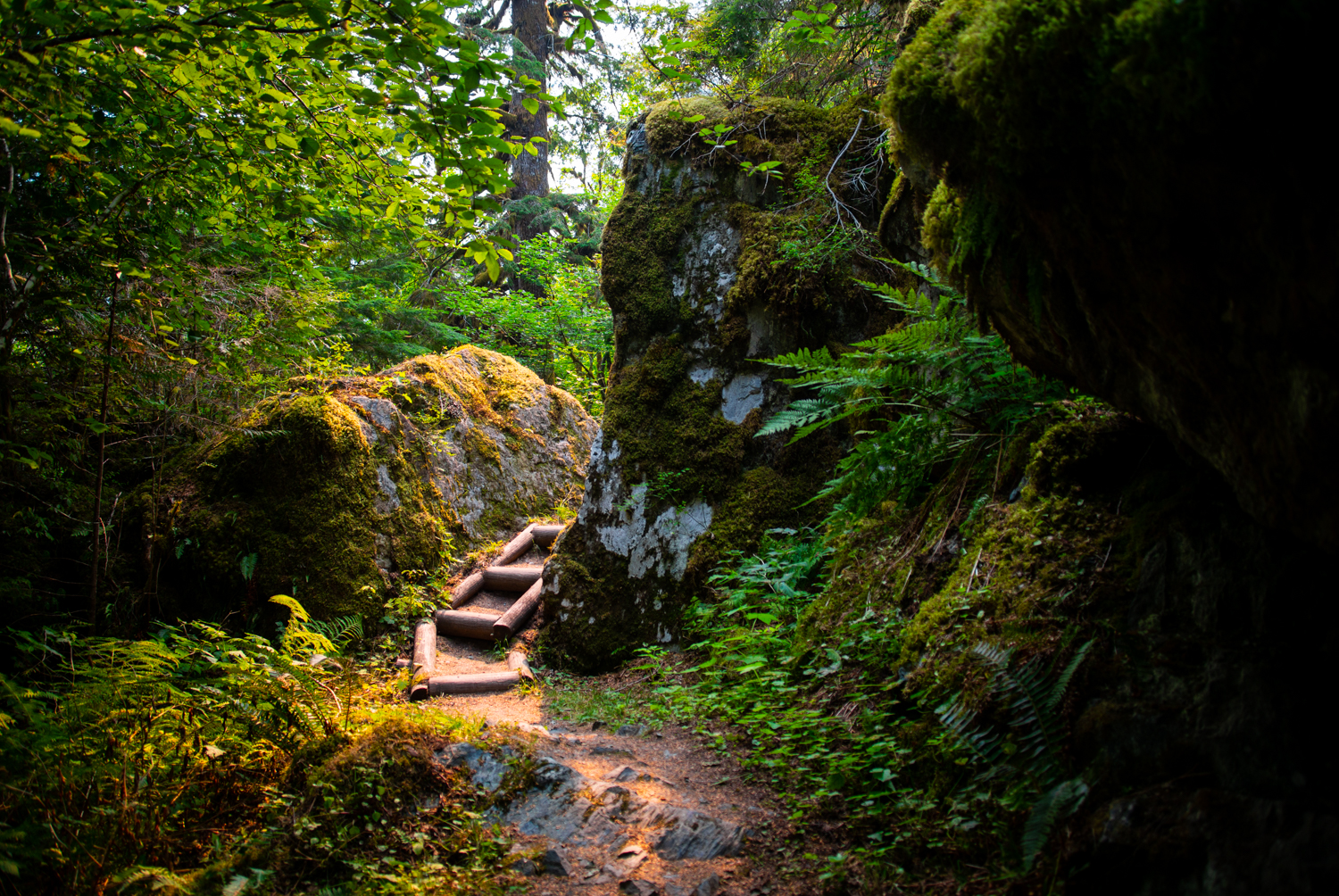 After crossing the bridge, we were no longer following along the river. Instead, the trail veered into the wild green yonder of the surrounding rainforest. This was maybe the most exciting part of the hike. The next several miles of trail toured along ridges and ravines that were dense with (plant) life. Fauna made no appearance, save for a few squirrels and slugs, in this stretch. The smoke clouded the treetops.