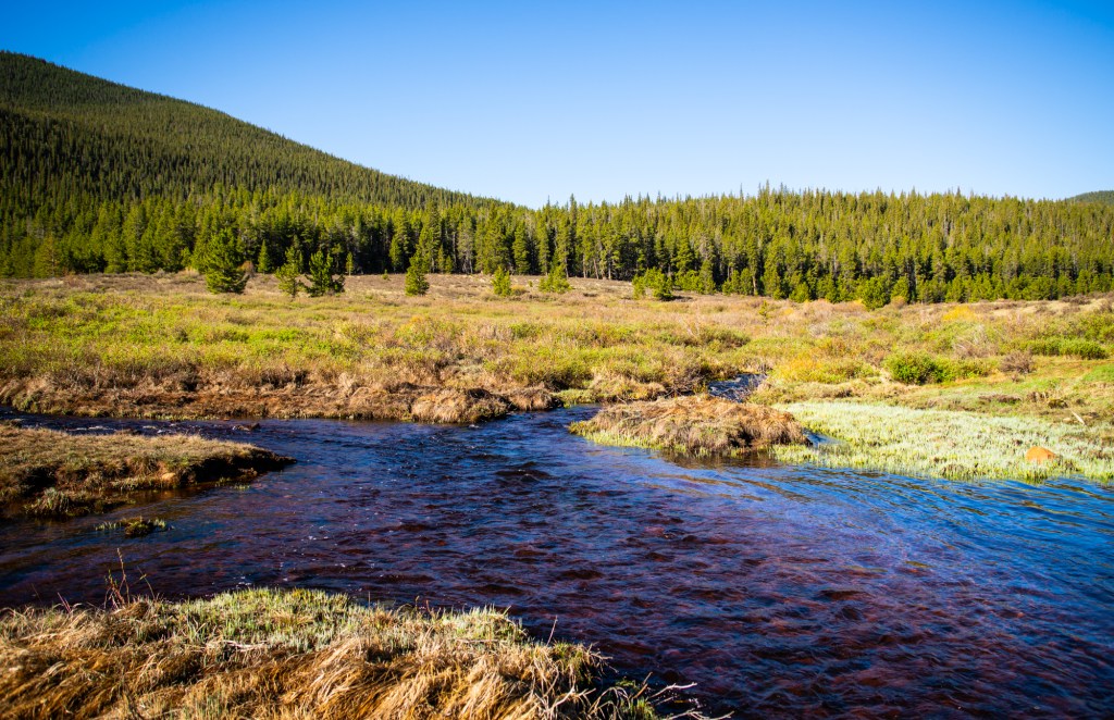 I forded Indian Creek three times over the mile that followed. The crossings were easy enough but I was glad to be sporting waterproof boots. At mile five I reached the junction of the Brookside-McCurdy trail and Ute Creek trail. It was here I’d turn east and eventually loop back north to reach the summit… but not before a long hydration and snack break!