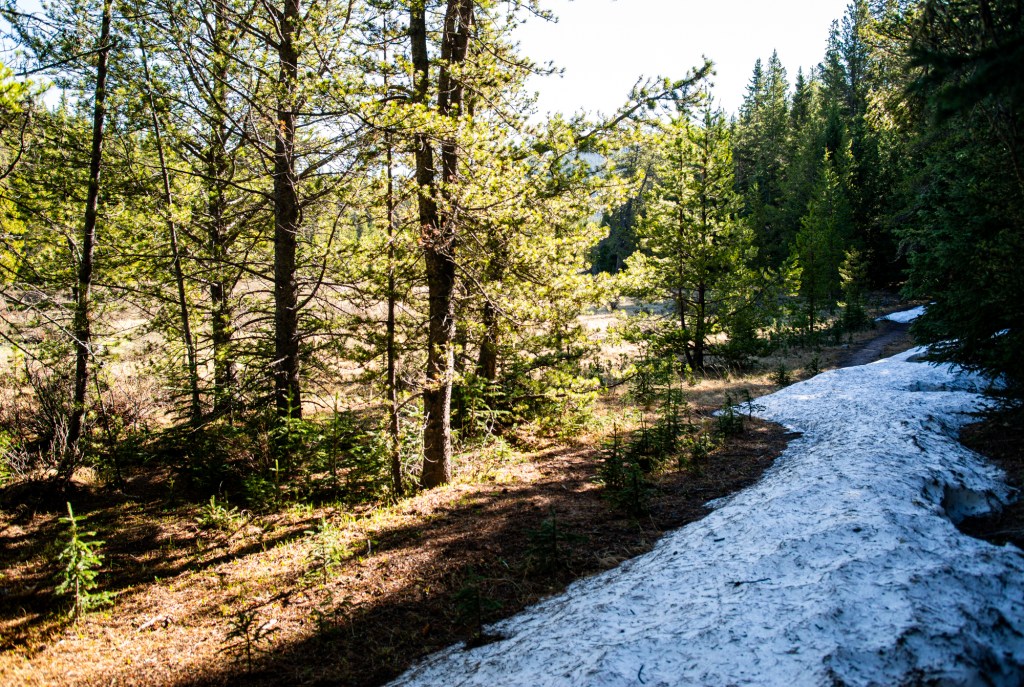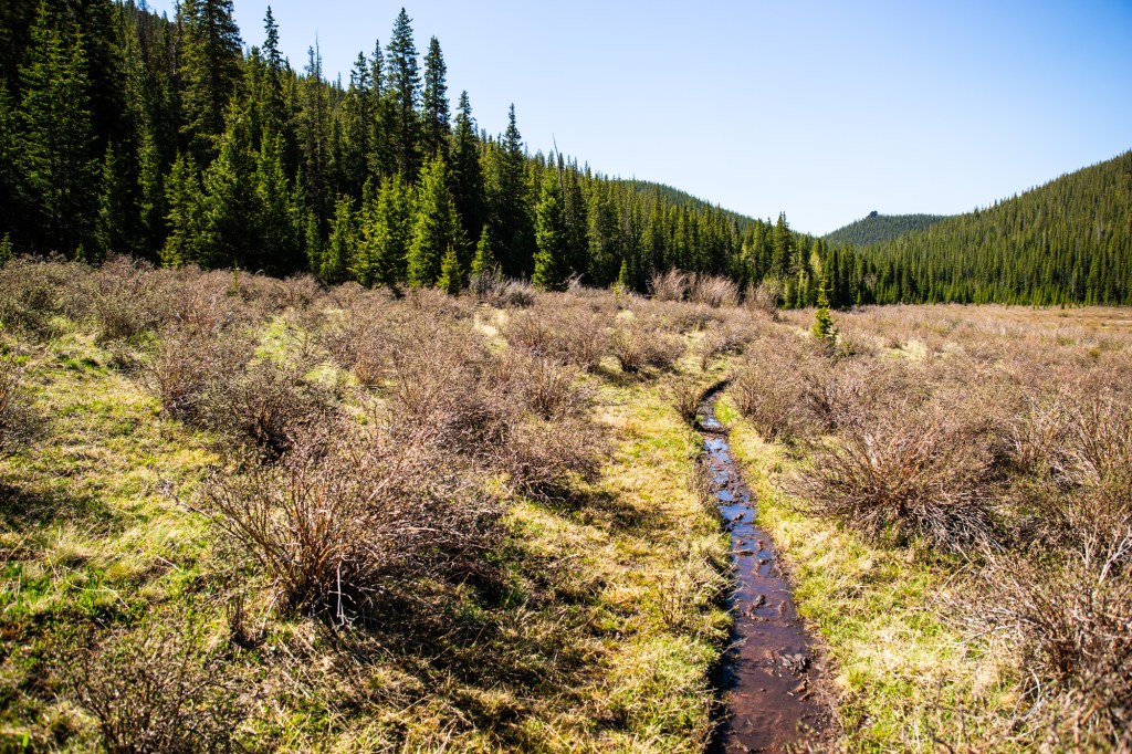 Snow-melt rendered the way forward quite wet and there was trickling water atop the majority of the path here. Mosquitoes swarmed but some new repellent I was trying out seemed to keep their presence tolerable. Near the two-mile mark, the trail exited the trees as Willow Gulch opened into a sprawling, flat, marshy park.