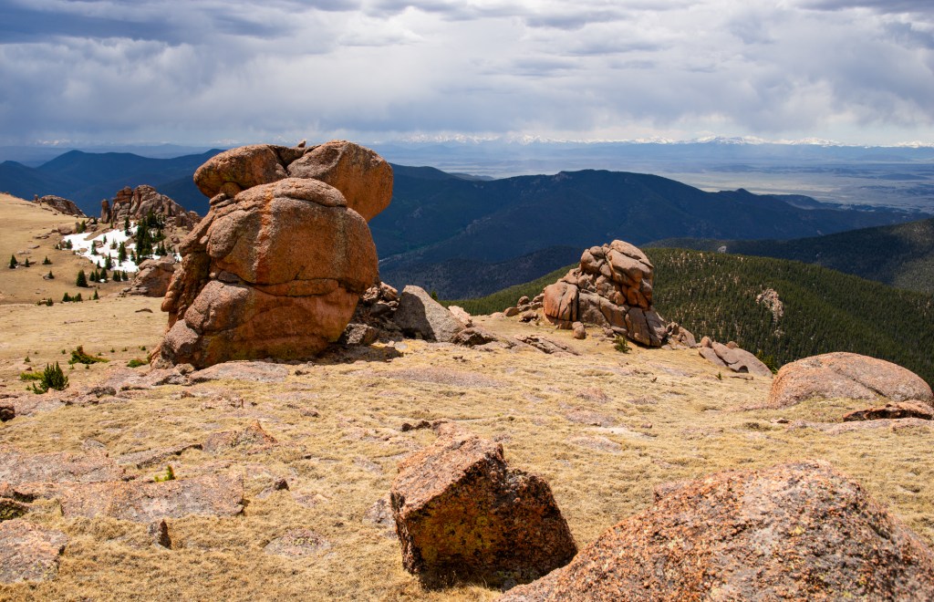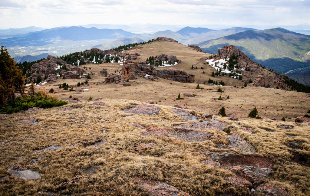 Bison Peak loomed ahead a little under a mile to the south. Intriguing, oddly-shaped granite rock formations festooned the plateau. I departed from the trail and started traversing the grassy area, taking another break once I reached the final 600′ uphill slog.