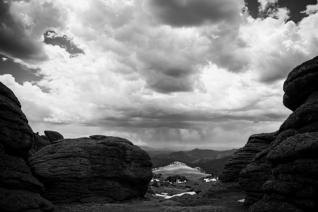 Moody storm clouds overhead crept toward the mountain. During my break, I wasn’t sure if I had the resolve to both make the summit AND get safely back below timberline before the storm rolled through. I checked the forecast with my GPS and decided it was safe enough—even with my snail’s pace—to continue