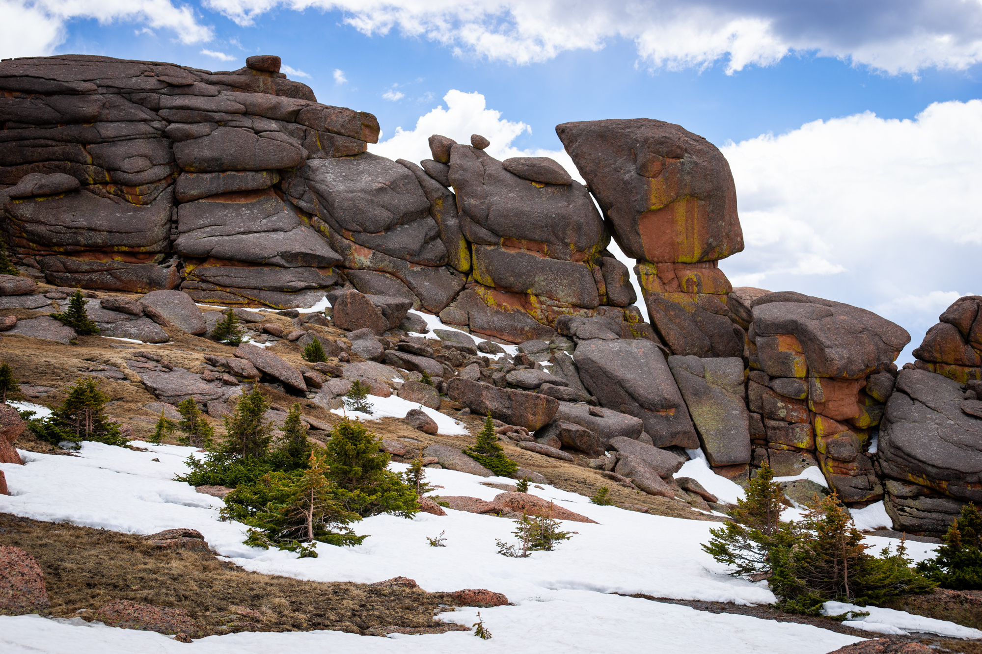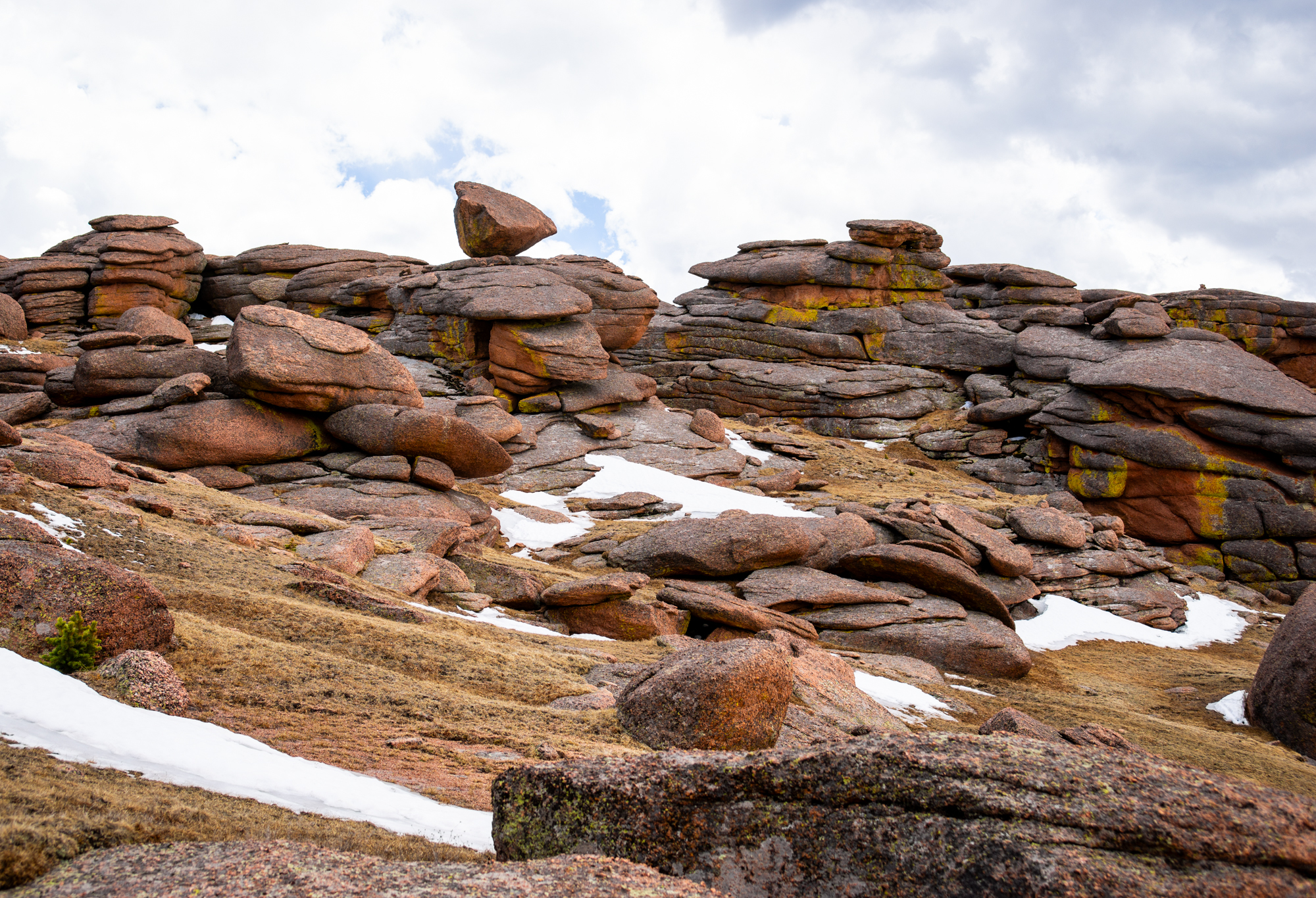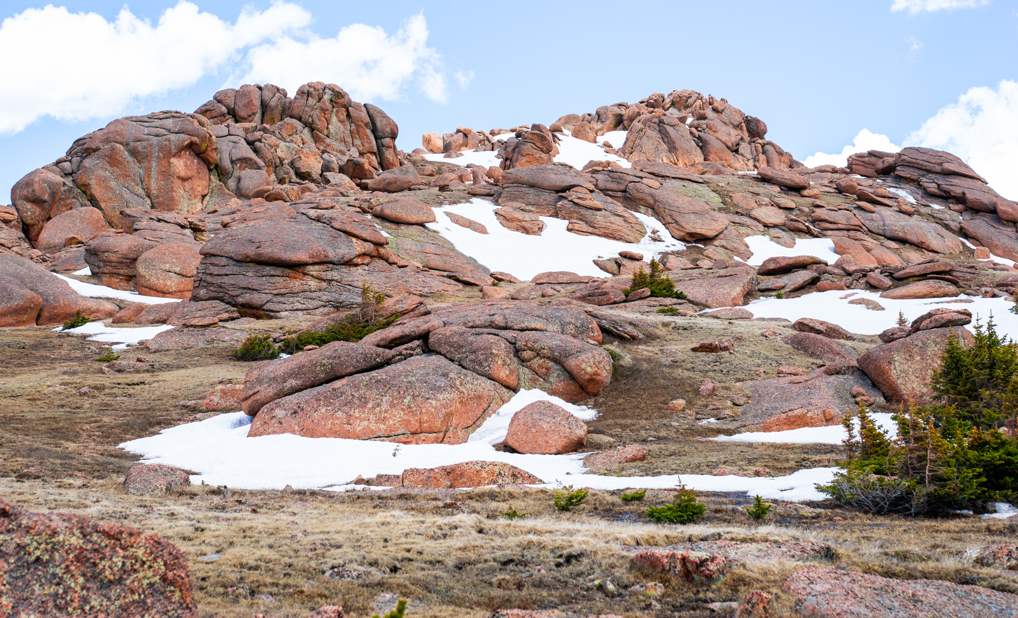 Bison Peak loomed ahead a little under a mile to the south. Intriguing, oddly-shaped granite rock formations festooned the plateau. I departed from the trail and started traversing the grassy area, taking another break once I reached the final 600′ uphill slog.