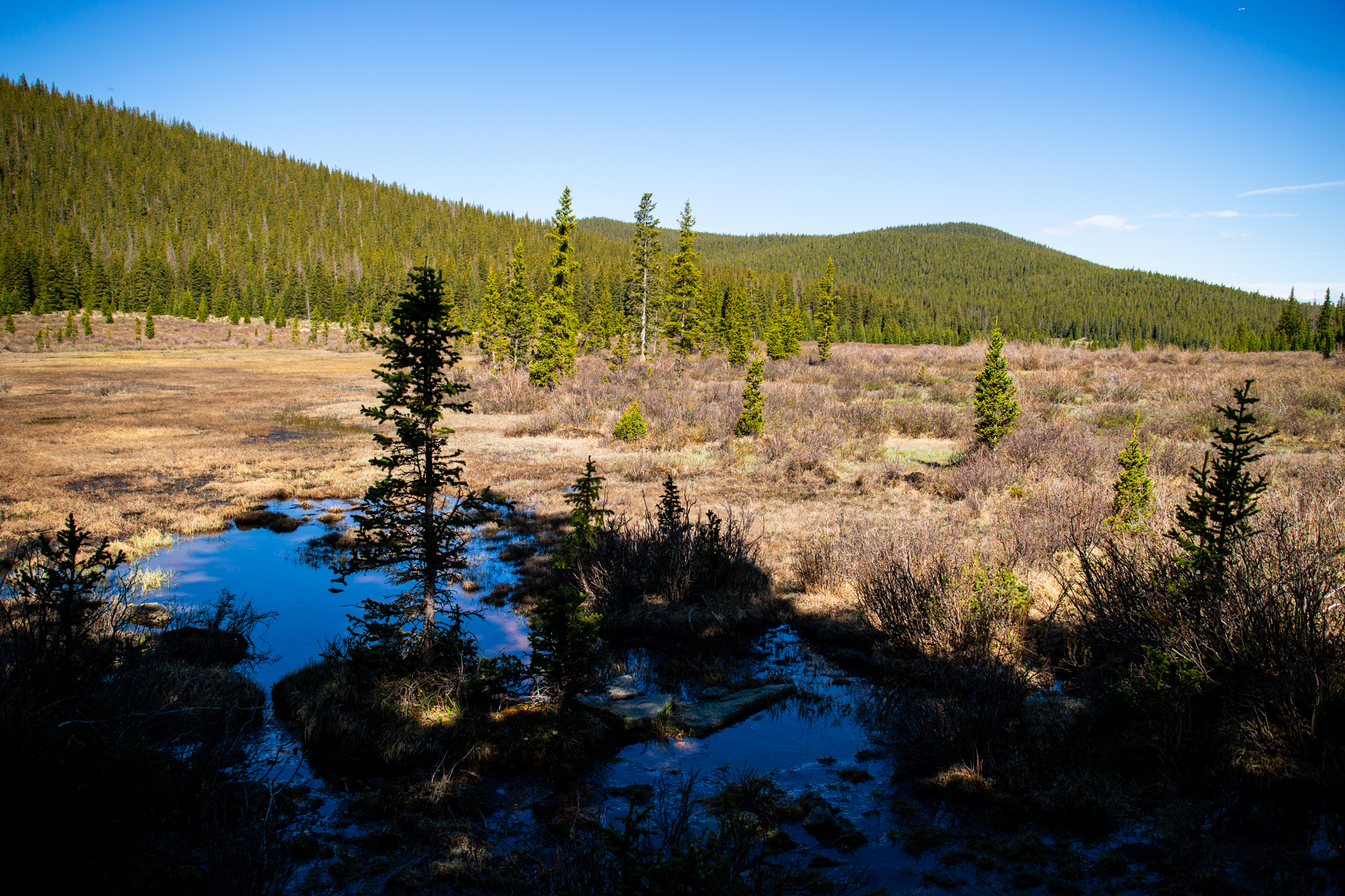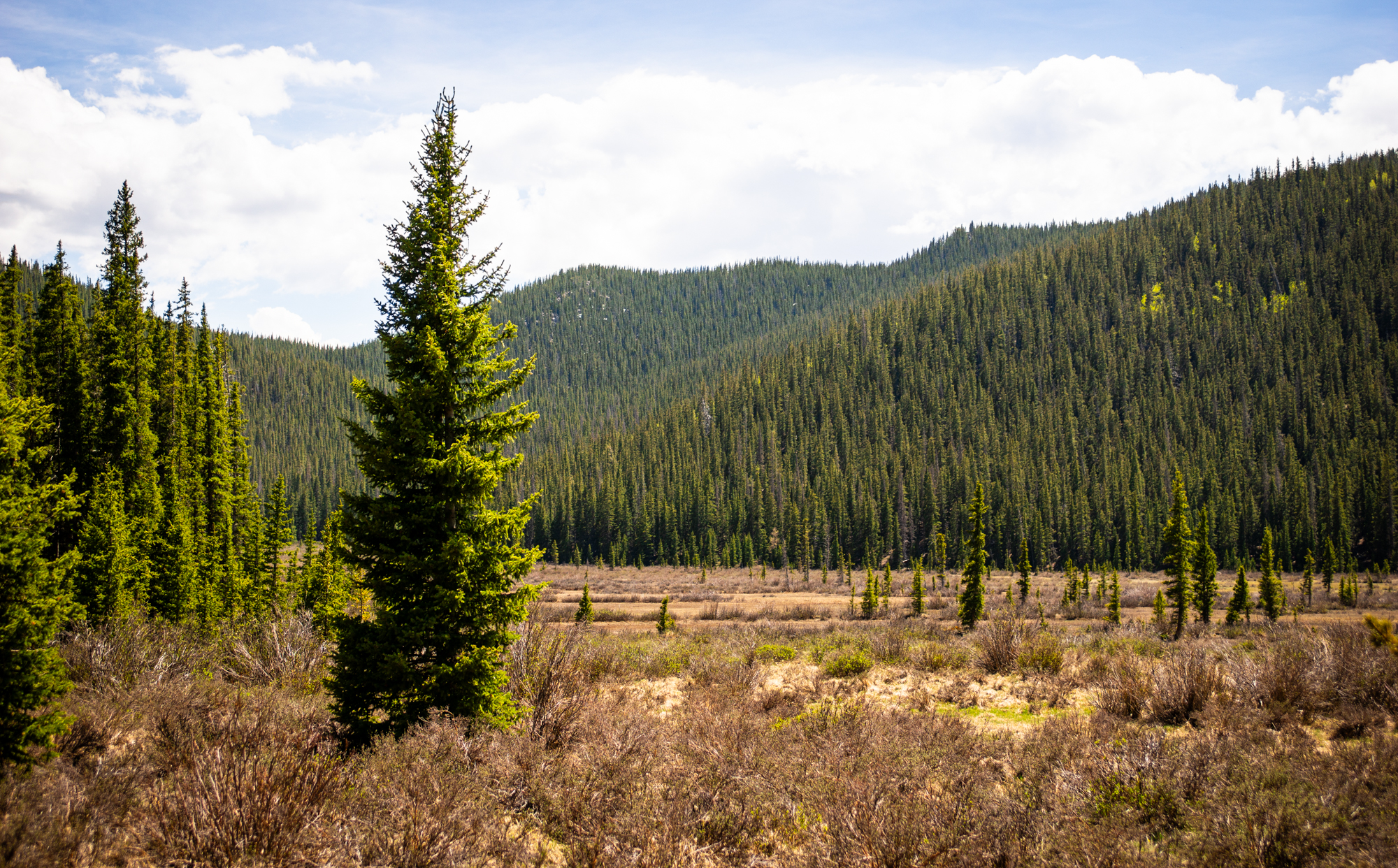 Snow-melt rendered the way forward quite wet and there was trickling water atop the majority of the path here. Mosquitoes swarmed but some new repellent I was trying out seemed to keep their presence tolerable. Near the two-mile mark, the trail exited the trees as Willow Gulch opened into a sprawling, flat, marshy park.