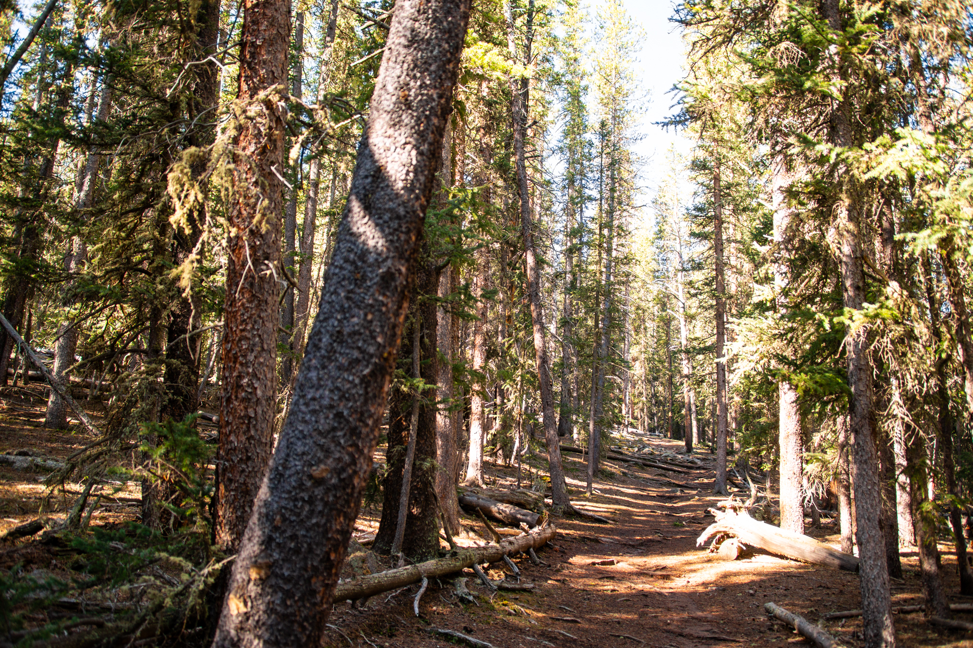 Daunting views of distant peaks came into view the higher I climbed. Winds rustled the tree branches all around. A series of switchbacks slowly led me to just under timberline where I found a sizeable plateau and some temporary respite from the arduous ascent.