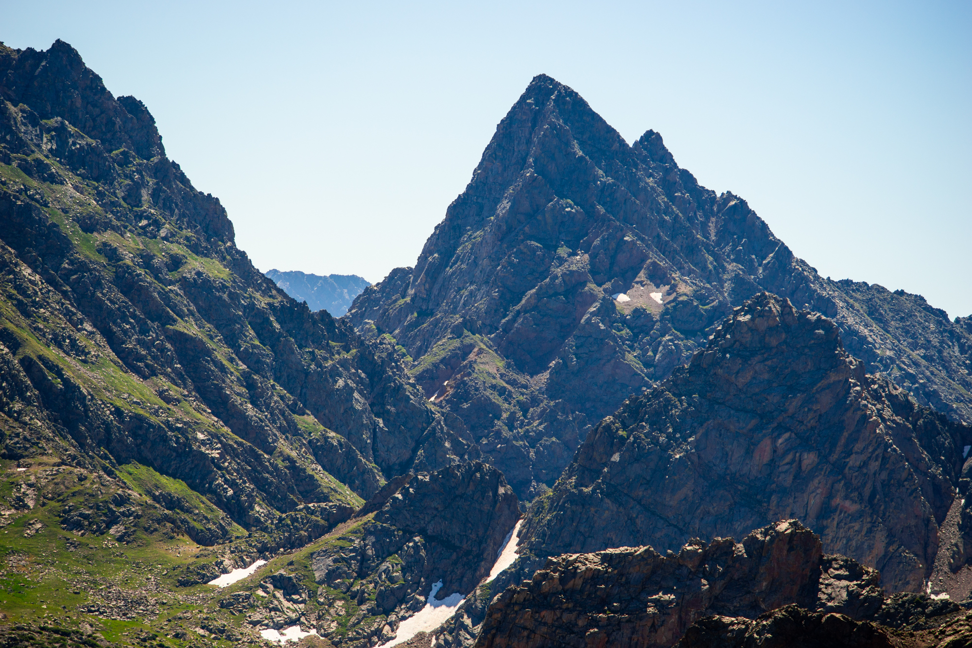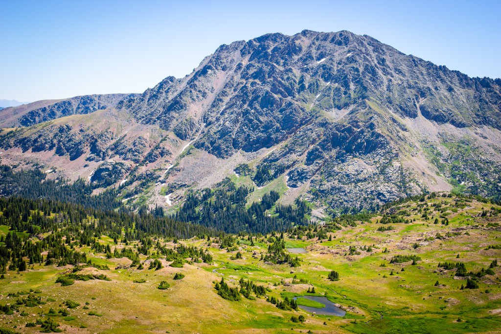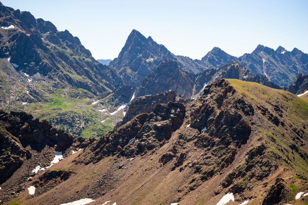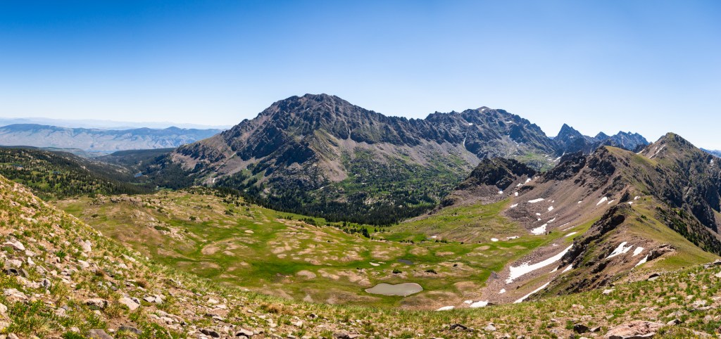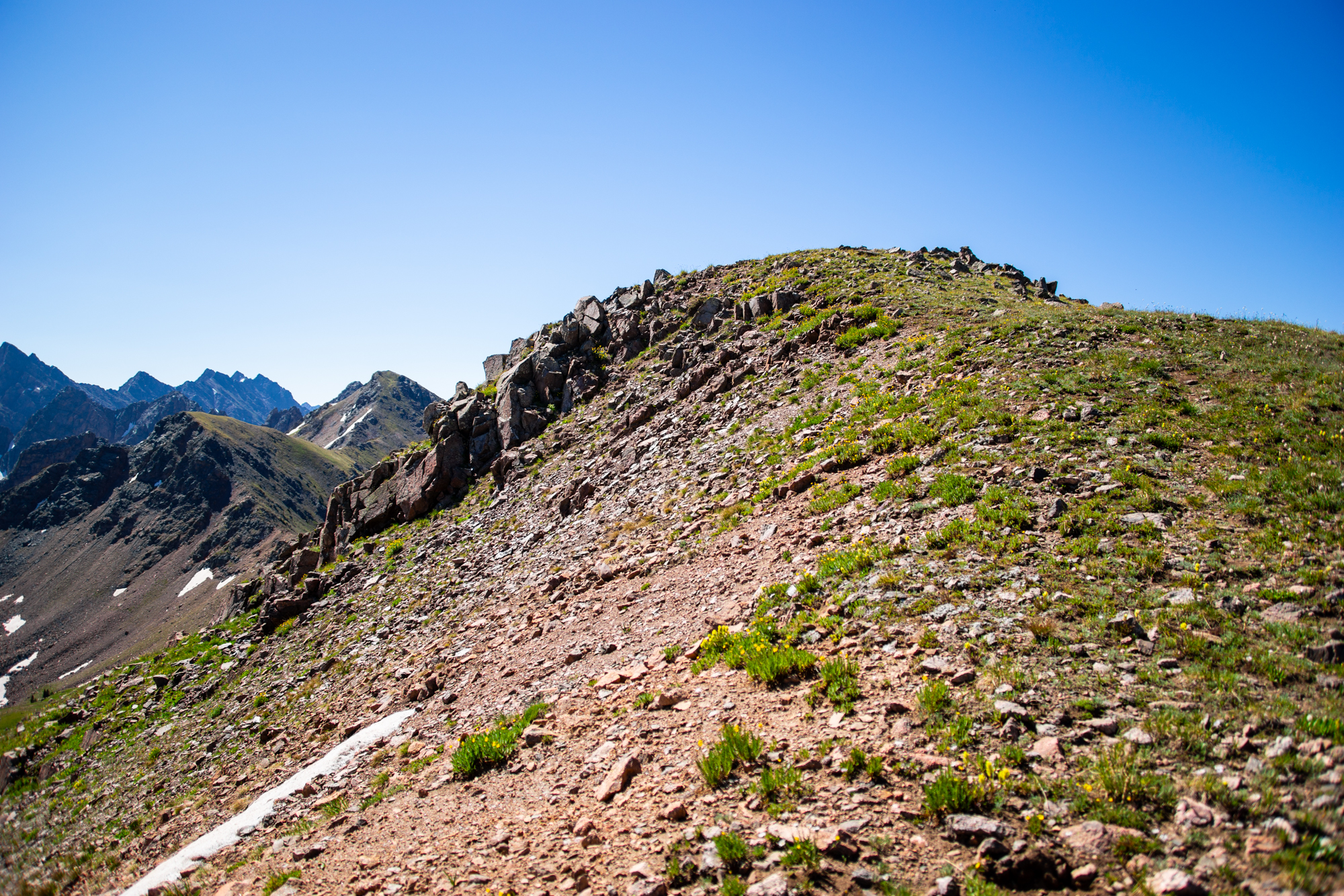 Dozens of shutter clicks later I’d had my fill; I gathered my belongings and started my descent. For reference, in the picture below, Eagles Nest (13,419′) is the leftmost prominent summit and Mt. Powell (13,586′) is connected via the ridge to its right.