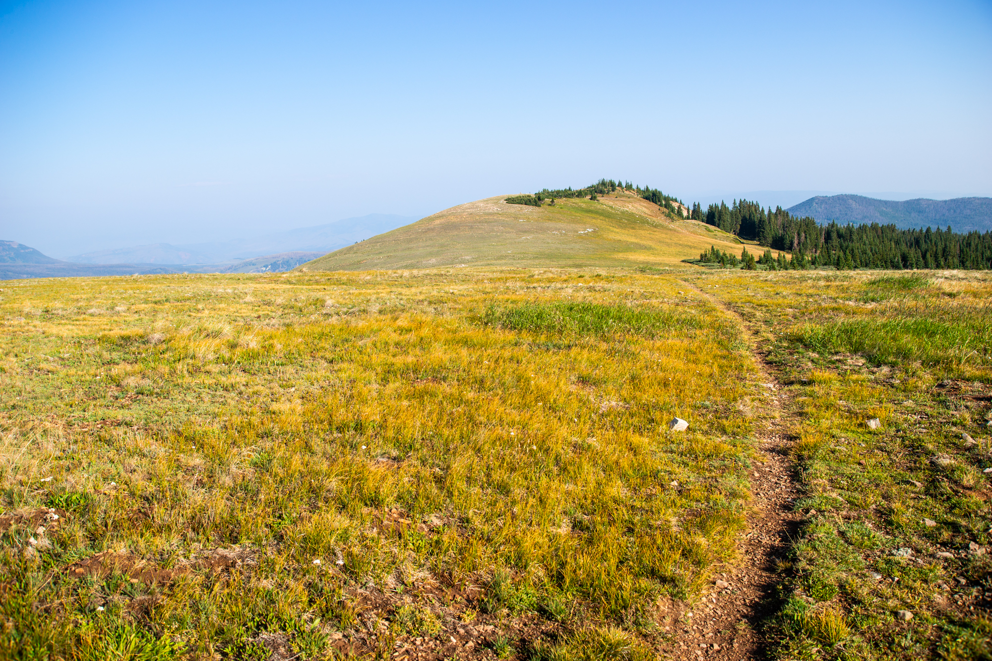 The consistent uphill relented as the terrain along the ridge began gradually undulating upward for the following two miles. Blustery winds began to pick up and may have helped to quell the surrounding haze some.