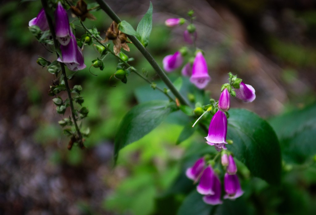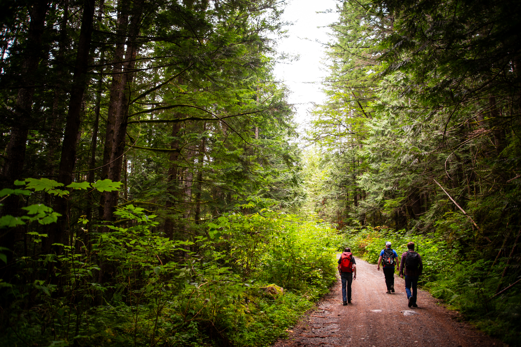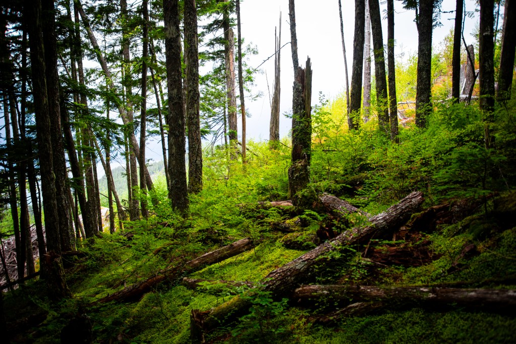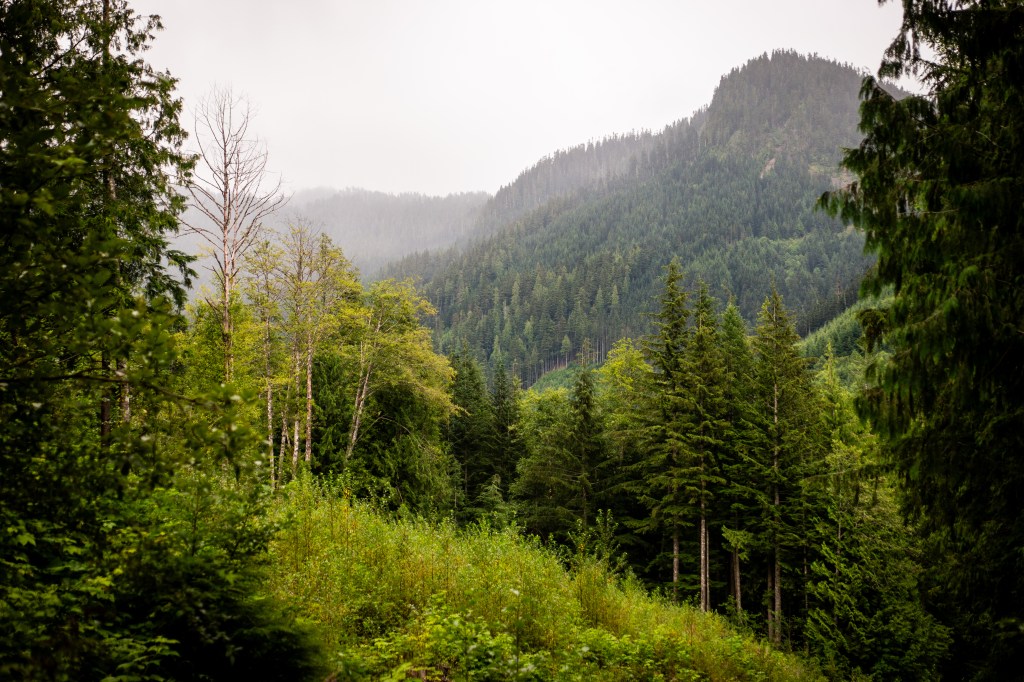 Plant life proliferated along the road’s edge, including wild raspberry and blackberry bushes bowed over with fruit. The Pacific Northwest’s characteristic moss-covered trees also towered overhead, creating a shady canopy. Wildflowers abounded. The soft mists drew the million shades of green into all the right kinds of contrast. Really, it was the ideal PNW hiking experience.
