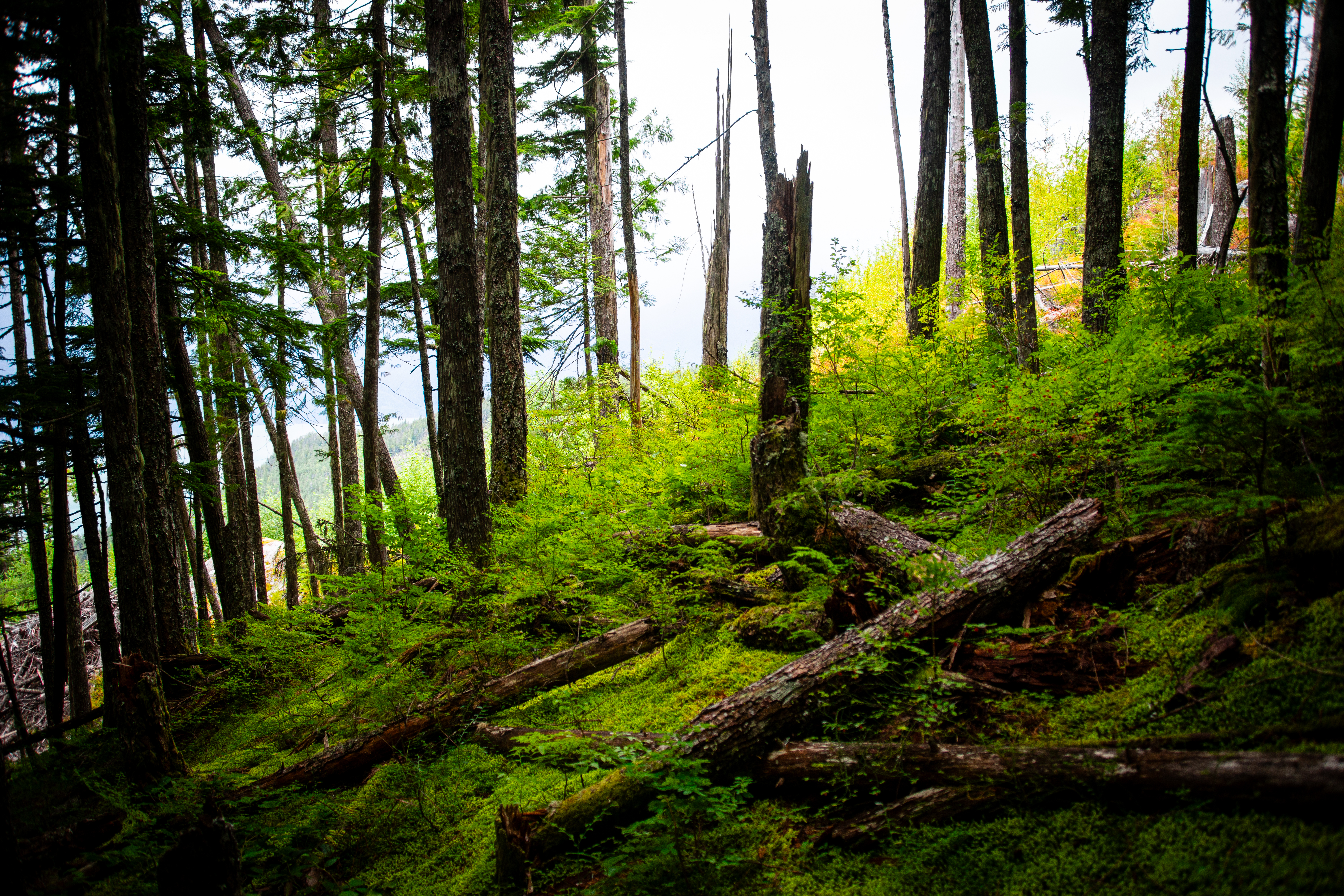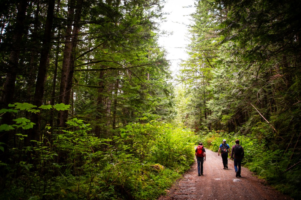 We didn’t need to travel far for our first hike of the trip. The hills behind Britannia Beach, it turned out, were littered with trails and logging roads. We set our sights on Goat Ridge, almost due east of town, and drove as far as we could in that direction before encountering a gate. Parking just below said gate, we were soon walking up a modest grade along a dirt road.